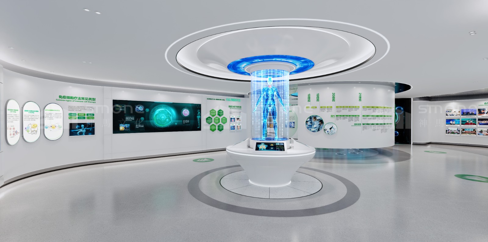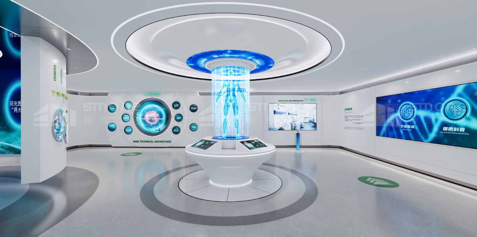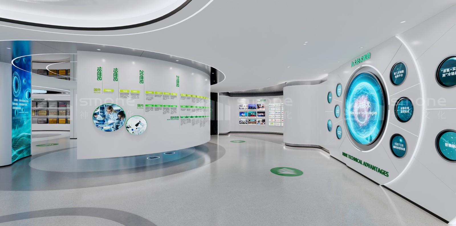 神馬文化通過提取北科生物的企業LOGO色、行業色,選擇了科技藍、未來白、生命綠三種顏色作為整個展廳的主色調。以此來打造兼具企業特色、科技感與健康生命力的展示空間。