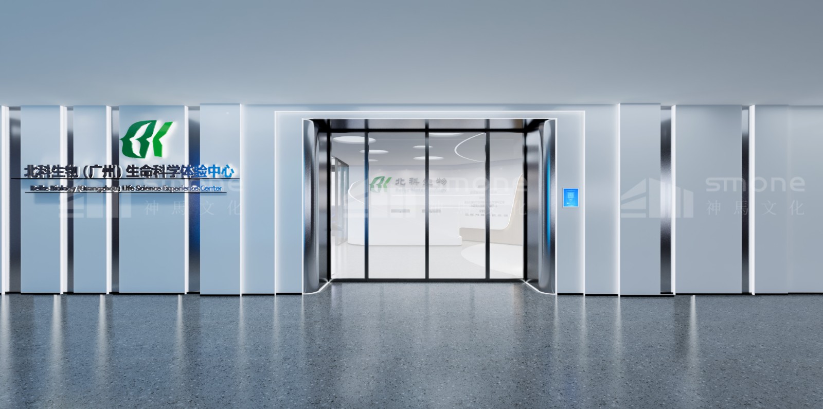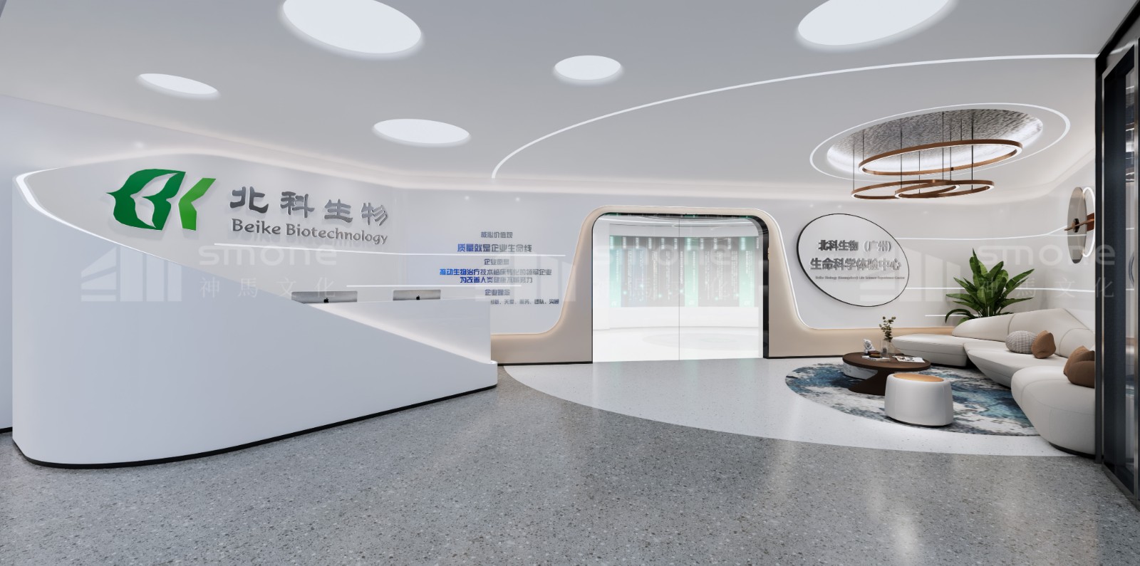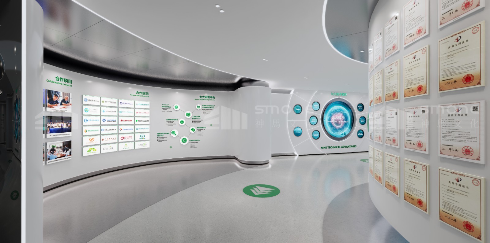神馬文化通過提取北科生物的企業LOGO色、行業色,選擇了科技藍、未來白、生命綠三種顏色作為整個展廳的主色調。以此來打造兼具企業特色、科技感與健康生命力的展示空間。