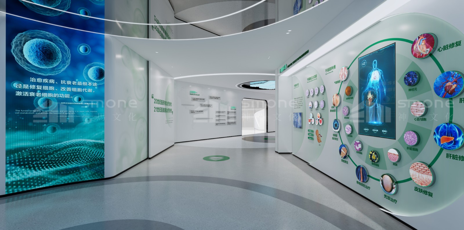 北科生物生命科學展廳總面積290㎡,為打造出企業作為細胞治療時代的引領者的形象神馬文化以“行業引領,健康筑夢”為主題,將空間重塑為探索生命奧秘的智慧殿堂。