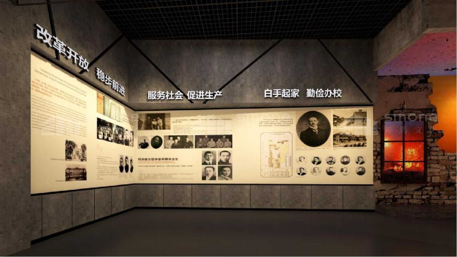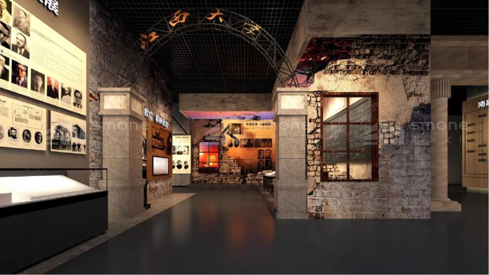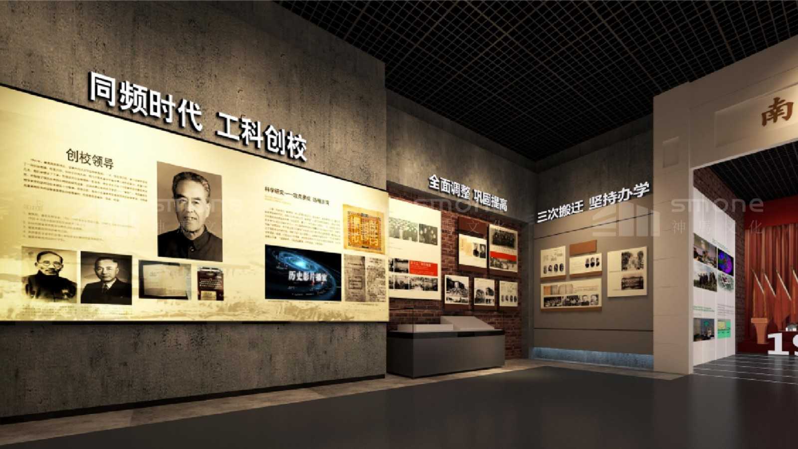 展示空間劃分為三個(gè)部分,其中在第三個(gè)部分中與科技元素和多媒體技術(shù)相結(jié)合,傳統(tǒng)歷史的氛圍到全新科技感氛圍的轉(zhuǎn)變,反襯出南昌大學(xué)的負(fù)重前行,不斷革新。